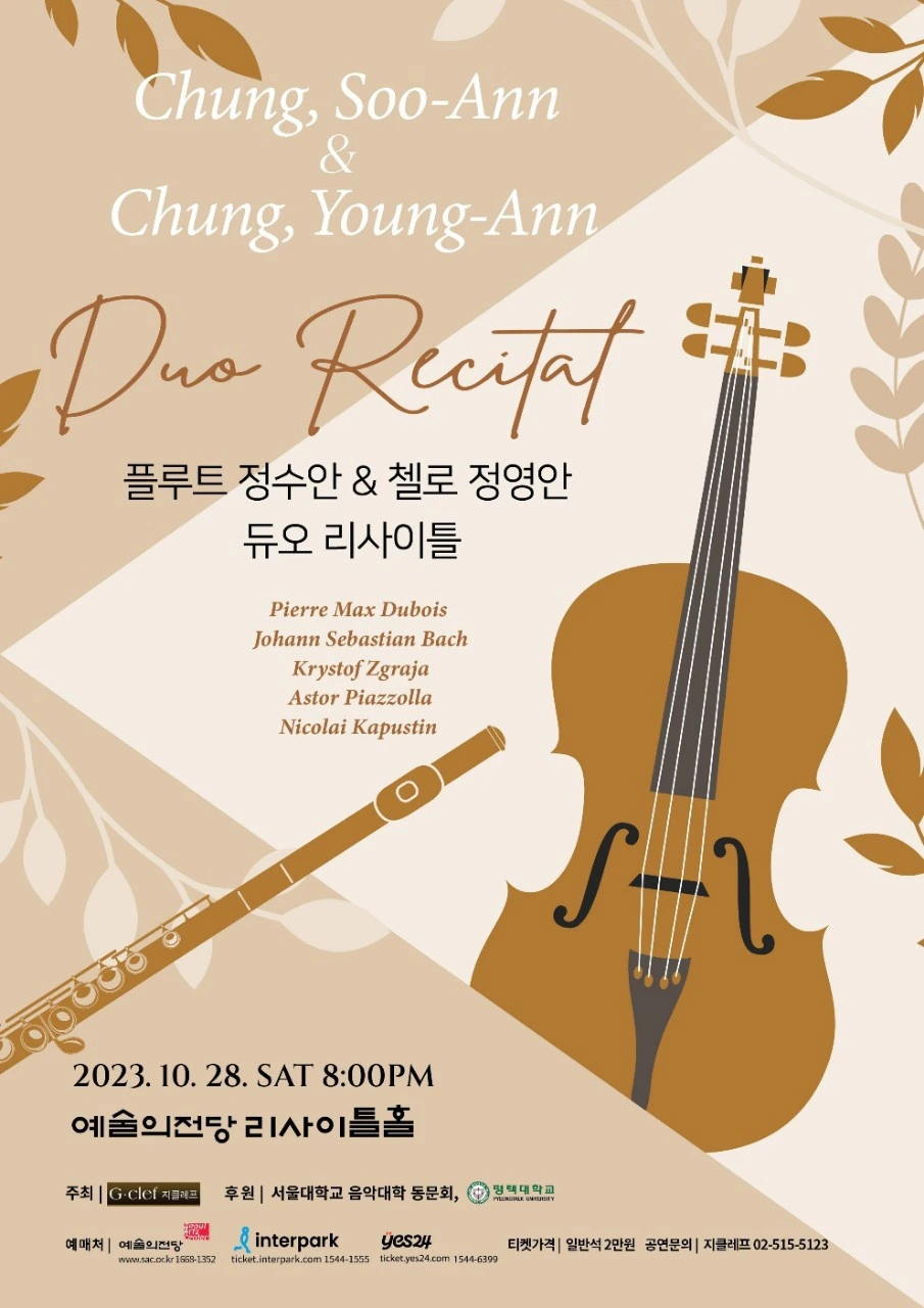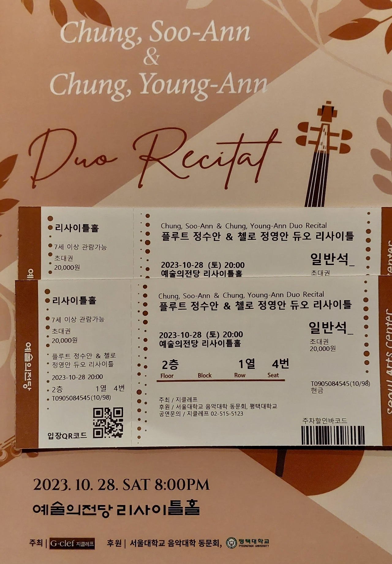 2023년 10월 28일(토) 8:00pm 예술의전당 리사이틀홀에서 <플루트 정수안 & 첼로 정영안 듀오 리사이틀>이 성황리에 열렸다. 로비에는 낙엽 만큼이나 많은 인파로 가득 차 있었다.