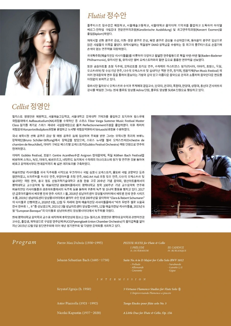 오늘 연주회는 피아노 반주 없는 플루트와 첼로 무반주 연주회다.Flutist 정수안과 Cellist 정영안! 이 듀오는 자매인 것 같은데 확인되지 않아 궁금증은 아직 그대로이다.