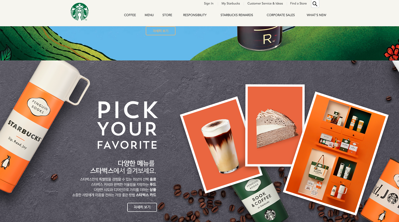 확실히 이미지 중심의 디자인으로 시즌 한정 제품과 프로모션을 강조하고 있다. 상품의 이미지를 크게 배치해, 직관적으로 나타내고 있다. 내비게이션 측면으로는 시각적 요소와 직관적인 버튼을 통해 사용자가 빠르게 원하는 정보를 찾을 수 있었다. ‘Pick Your Favorite’과 같은 슬로건이 사용자의 감정을 이끌어주는 역할을 한다. 다양한 카테고리의 메뉴가 상단에 배치되어 있어 메뉴 접근이 비교적 쉬운듯하다.