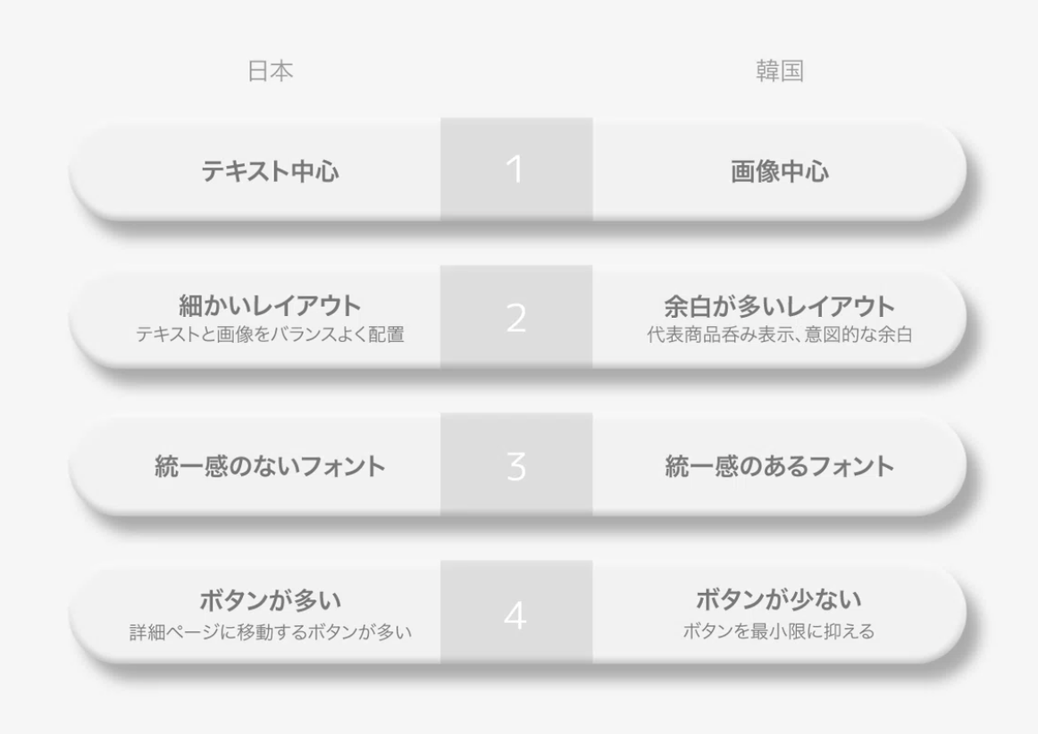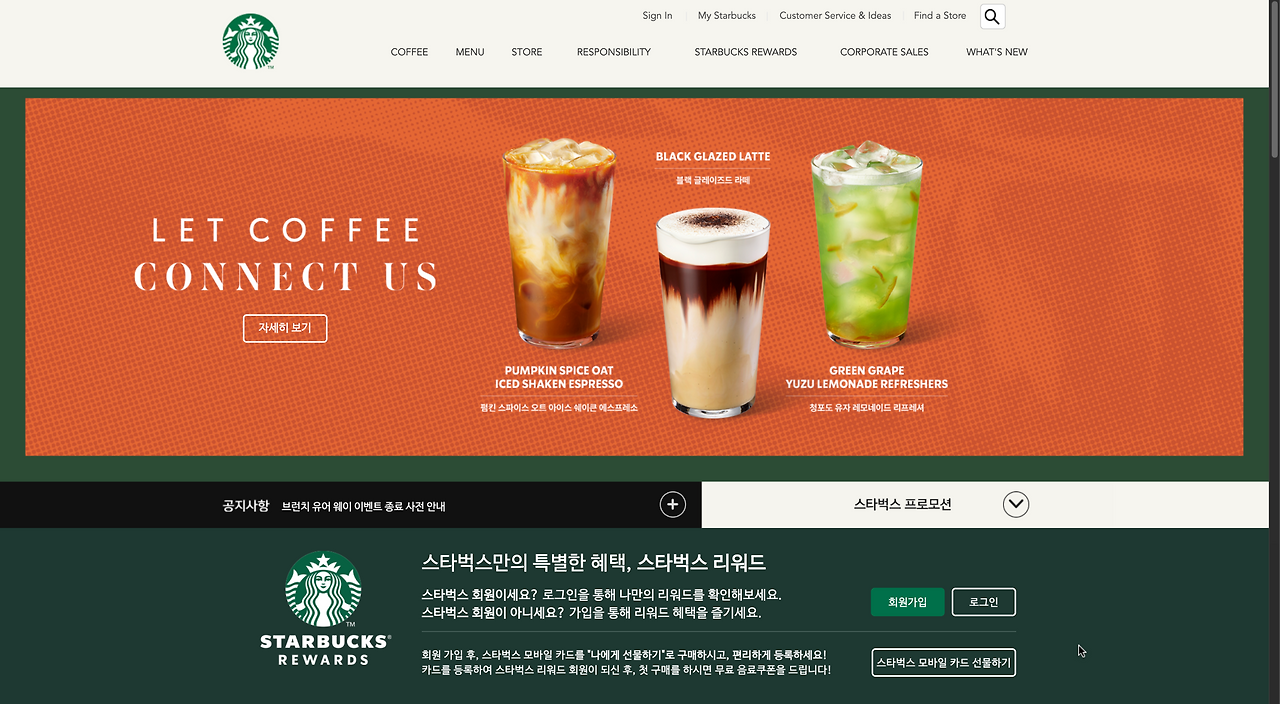 첫 번째로 문화적 차이를 생각할 수 있었다. 일본은 정보의 깊이를, 한국은 직관성을 우선시하는 경향이 있다. 텍스트 중심의 세부 정보 제공을 중시하는 일본과 달리, 한국은 이미지와 시각적 요소로 사용자에게 더 직관적인 경험을 제공한다. 지금의 일본 웹사이트에서 한국은 전체 화며에 큰 이미지를 배치하는 디자인을 선호한다. 이것은 각 나라의 비즈니스 관습의 영향이라고 볼 수 있다. 상품의 홍보를 중요시 여기는 한국과 달리 일본은 상품의 효과나 정보를 직접적으로 전달하는 부분이 많다. 이미지보다 정확한 정보를 제공함으로 UX면에서 긍정적인 역할을 도모하는 듯하다. 예시로 각 나라의 스타벅스 사이트를 비교해 보았다.
