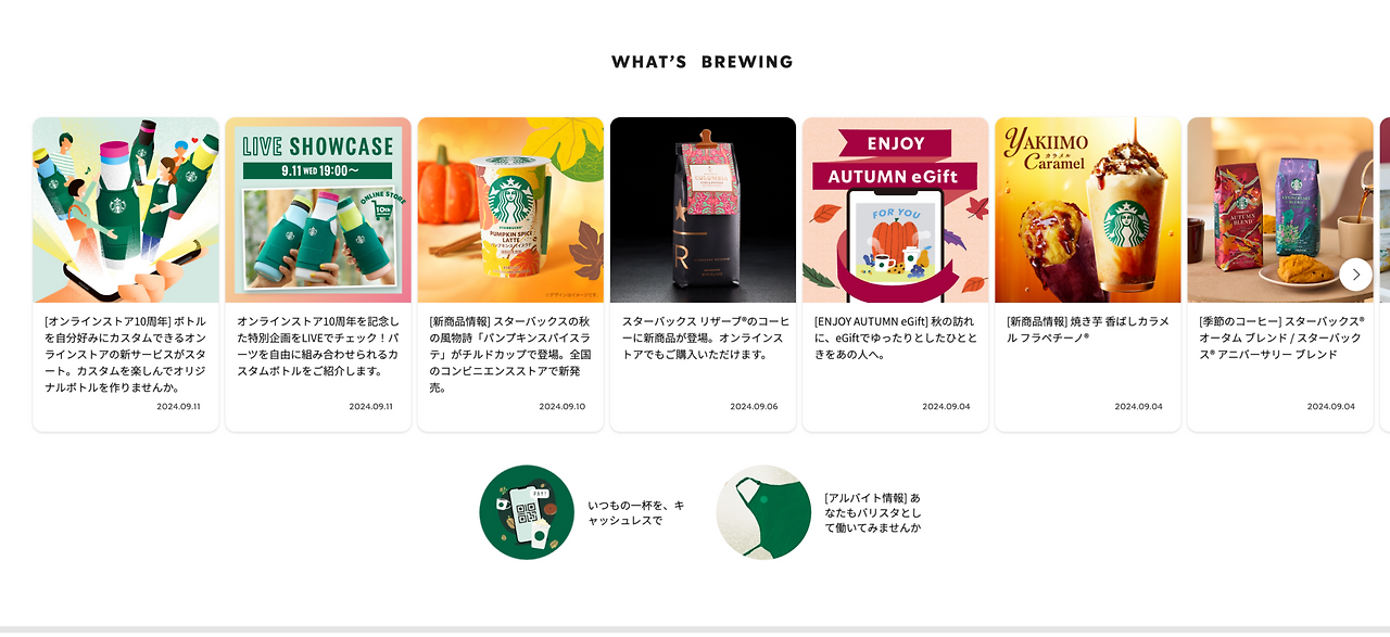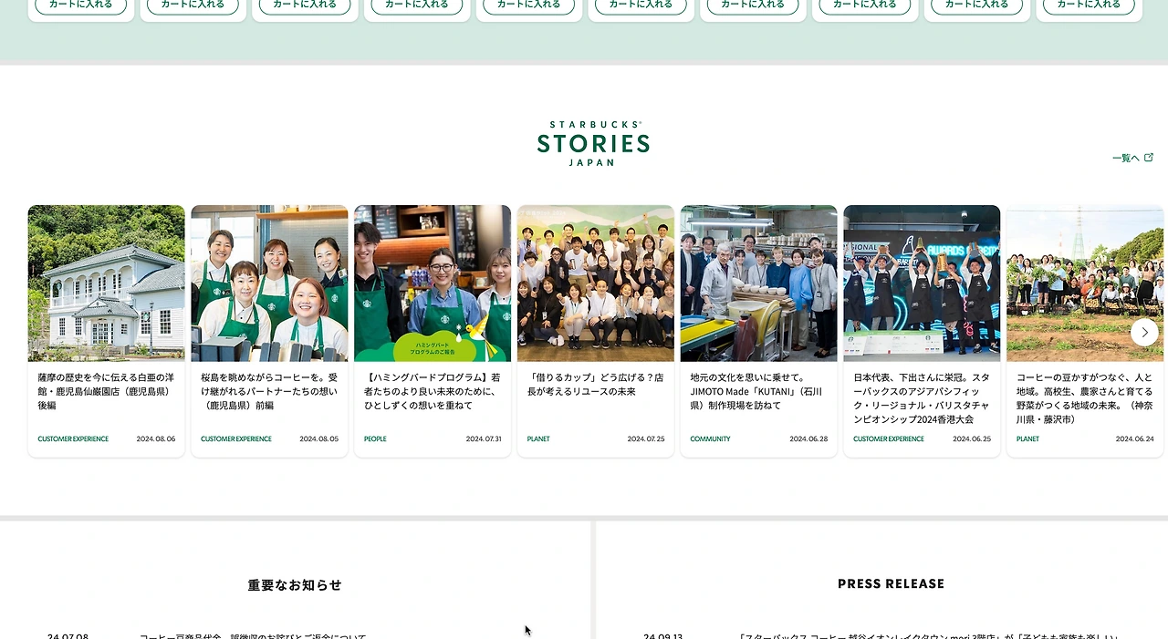 꽤나 흥미로웠던 것은 Starbucks Stories Japan의 섹션의 캐러셀이었다. 스타벅스의 사회적 활동과 지역사회와의 연결, 매장 파트너들의 이야기, 그리고 환경보호에 대한 이야기였다. 일본 스타벅스가 추구하는 가치와 비전을 나타내고 고객과 사회적 관계를 중시하는 철학을 느낄 수 있었다.