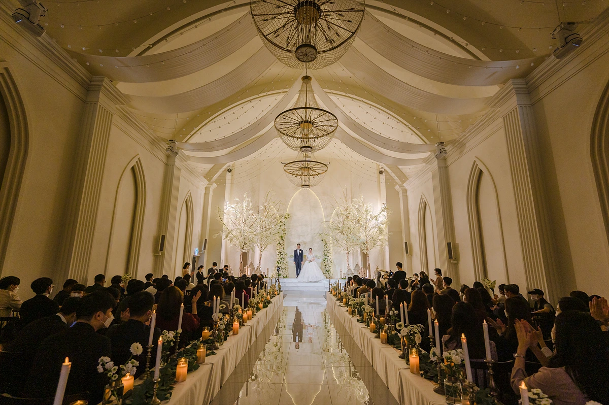 웨딩홀은 컨벤션 형태의 둥근 테이블이 아닌 흔히 채플형이라고 하는 하객이 모두 단상을 바라보는 구조를 원했다. 컨벤션 형태의 결혼식장을 몇 번 가봤는데 신랑 신부에게 집중도가 떨어지는걸 여러 번 경험했기 때문이다.