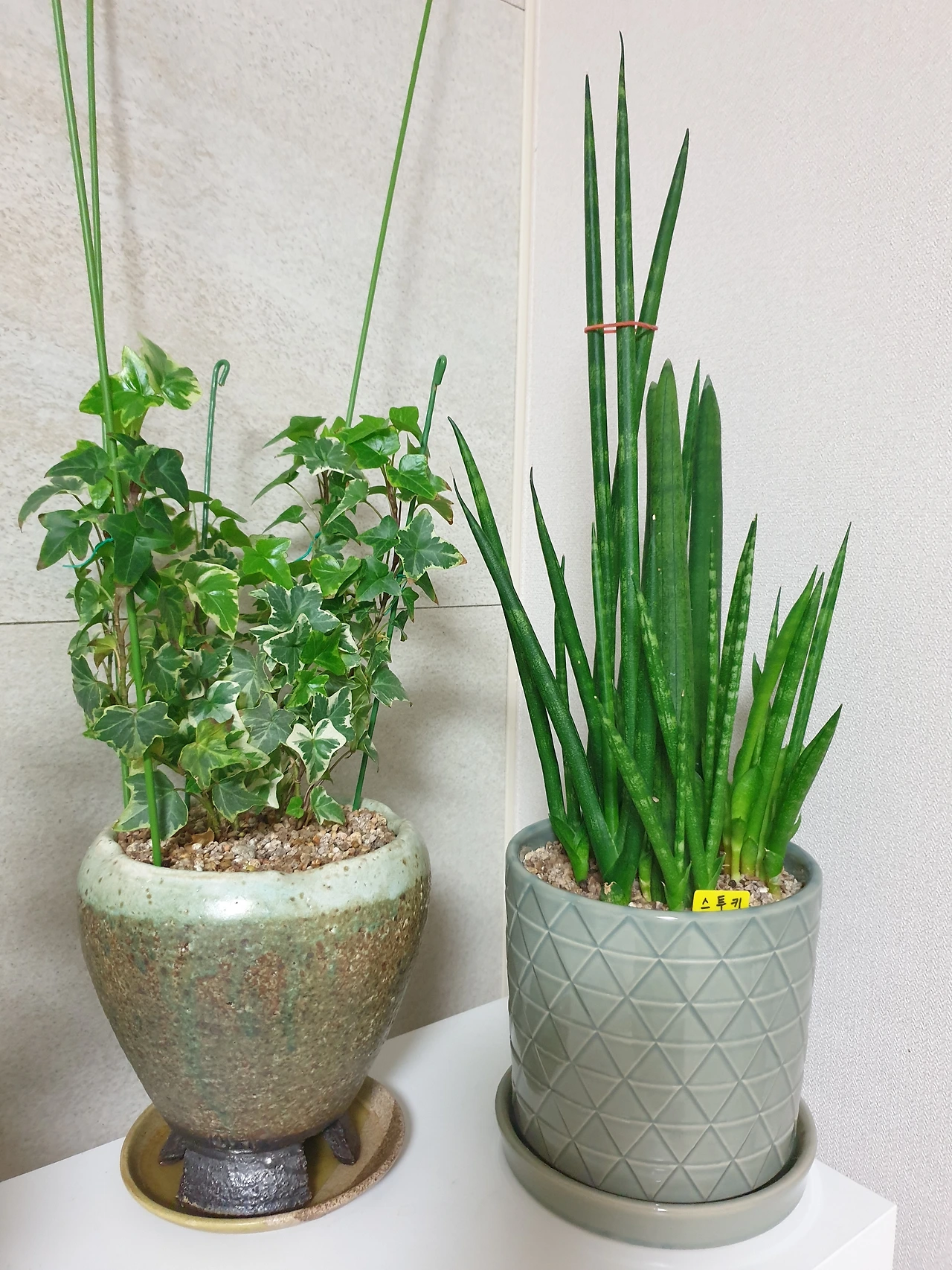 우연히 오일장에 갔다가 화초가 눈에 띄길래 쪼그려 앉아 한참을 구경하고 사온 스투키와 아이비는 우리 집 생활이 좀 힘든지 비실비실하여 제일 햇빛이 많이 들어오는 창문 바로 앞에 두고 키우고있다.