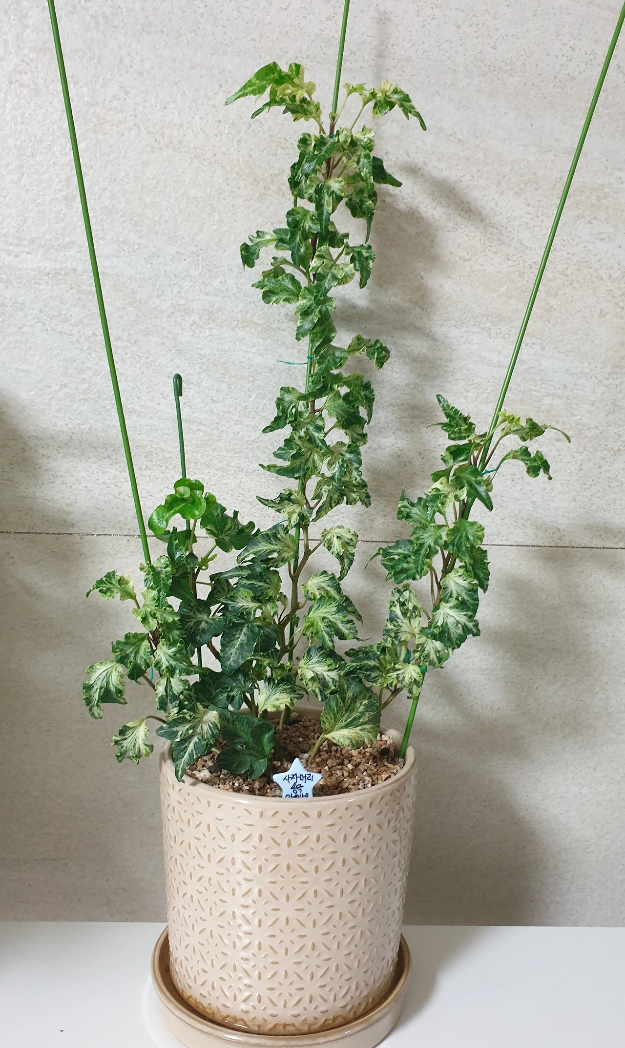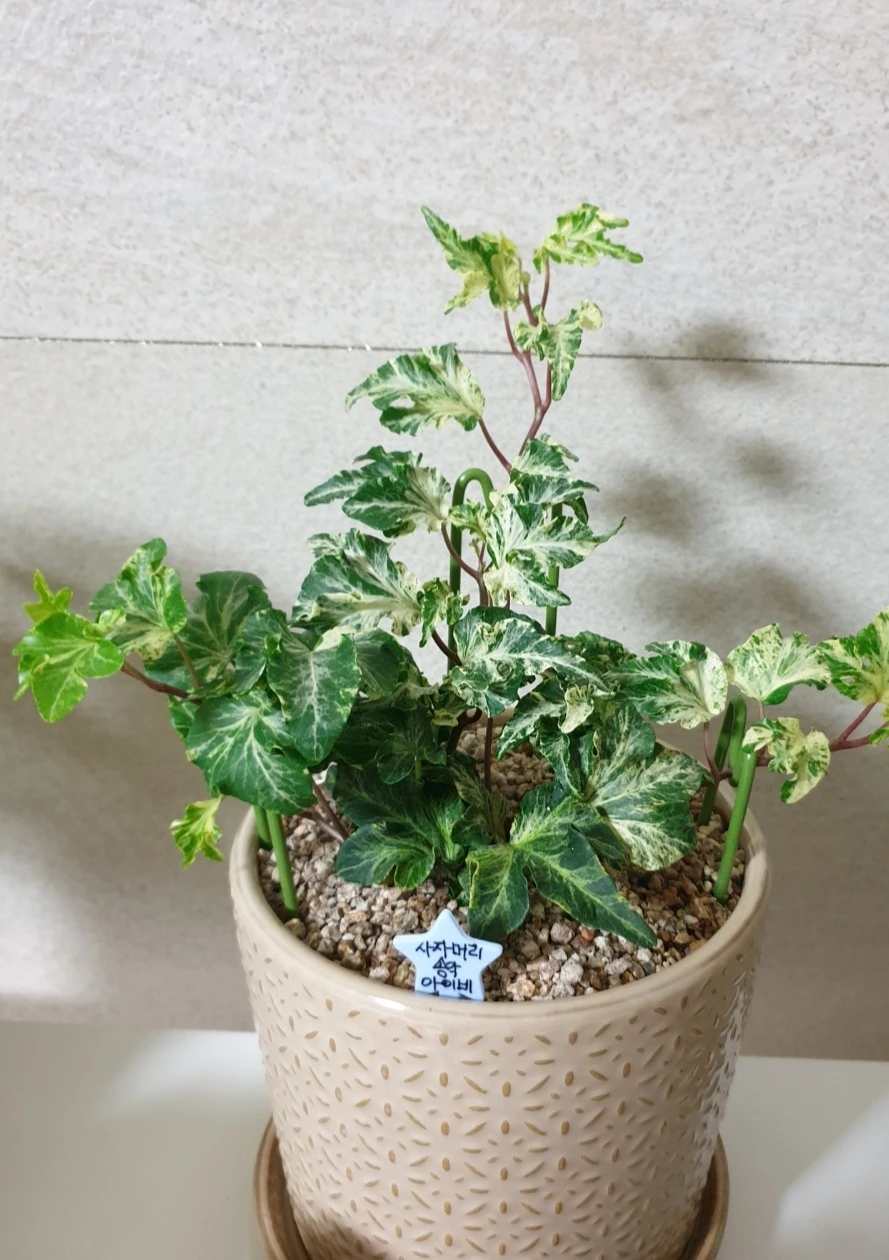 구미 옥계 식물원에 다육이를 구입하러 갔다가 아이비 중에서도 특이종이라 눈에 띄었다. 덩굴식물이라 받침대를 세워주었더니 지금까지 싱싱하게 잘 자라주고 있다.