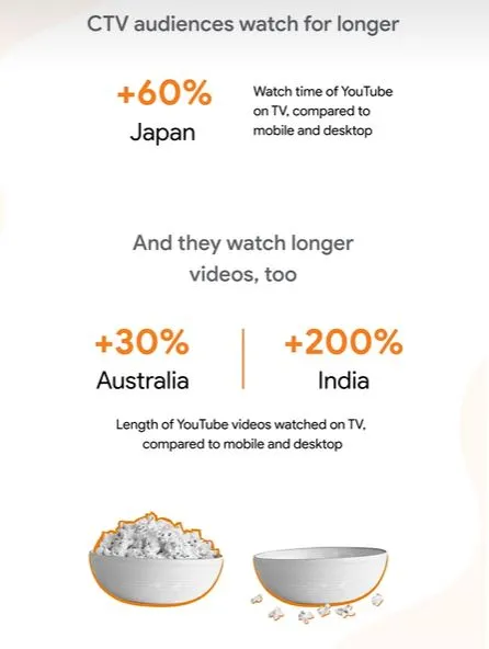시청시간 기준으로 보면, 아마 홈 디바이스인 TV가 가장 우위일 것입니다. TV의 큰 화면은 몰입해서 보기에도 좋고, 몰아서 보기에도 매우 적합하죠. 실제 조사 결과에 따르면, 커넥티드TV를 통해 유튜브를 보는 시청자들은 모바일/PC로 보는 사람보다 60% 오래 시청하고, 영상길이 역시 더 긴 영상을 선택한다고 합니다.