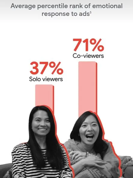 사람들은 그 어느 때보다 많이 TV 화면을 통해 유튜브를 시청하고 있습니다. 한 조사에 따르면, 응답자의 67%가 다른 사람과 함께 있는 공간에서 유튜브를 시청한다고 답했습니다. 그리고 이것의 가장 큰 원인은 자신이 보고있는 영상을 다른 사람에게 소개하고 싶기 때문이며, 또한 응답자의 79%가 다른 사람들과 함께 유튜브를 시청할 때 더 깊은 유대감이 생긴다고 대답하기도 했습니다. 또한 혼자 시청할 때 보다 함께 시청할 때 광고에 대한 정서적 반응이 2배 가량 상승한다는 조사 결과도 있습니다.