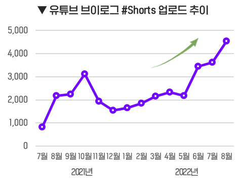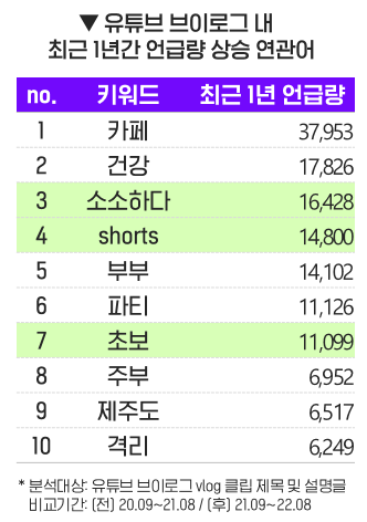 또한 브이로그 급상승 연관어 상위권에 'Shorts'가 눈에 띄는데요. 공들인 편집이 필요한 길이에서 벗어나, 간편하고 빠르게 일상의 순간들을 업로드하는 '숏로그(short+vlog)' 들이 꾸준히 증가하는 추세입니다.