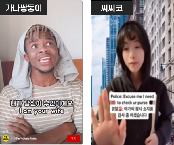 생활 속에서 일어나는 다양한 상황을 구성하고 코믹하게 재연한 콘텐츠로, 최근 가장 좋은 반응을 얻고 있는 유형입니다. (현재 인기 쇼츠 콘텐츠 중 절반 이상을 차지하고 있는 유형이죠.) 가나에서 온 쌍둥이 형제의 상황극 채널인 ‘가나쌍둥이’는 유창한 한국어와 표정 연기로 재미를 선사하며 인기를 얻었습니다. 영어와 한국어를 섞어 일인다역 상황극을 찍는 ‘씨씨코’는 서비스 초기부터 활약하며 급성장 중이고, 최근에도 ‘사내뷰공업’, ‘스낵타운’, ‘세얼간이’ 등 유사한 유형의 신규 채널들이 지속적으로 생겨나고 있습니다.
