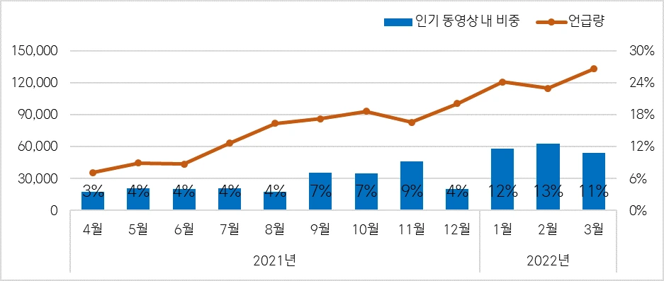 이후 쇼츠 일일 조회수는 ‘21년 1분기 65억뷰에서 2분기 150억뷰로 2배 이상 증가했으며, 2022년 1월에는 유튜브 쇼츠의 총 누적 조회수가 5조를 돌파하며 첫 선을 보인 지 1년여 만에 폭풍 성장한 것으로 나타났습니다. 국내 역시 쇼츠에 대한 관심이 지속적으로 높아지고 있는데요. 유튜브에서 ‘쇼츠’에 대한 언급량은 ‘21년 4월 3만에서 ‘22년 3월 13만으로 약 4배 증가하였습니다. (출처: LUCY) 유튜브 인기 동영상 내 쇼츠 비중 또한 ‘21년 2분기 4%에서 ‘22년 1분기 12%로 상승하며 좋은 성과를 보이고 있습니다.