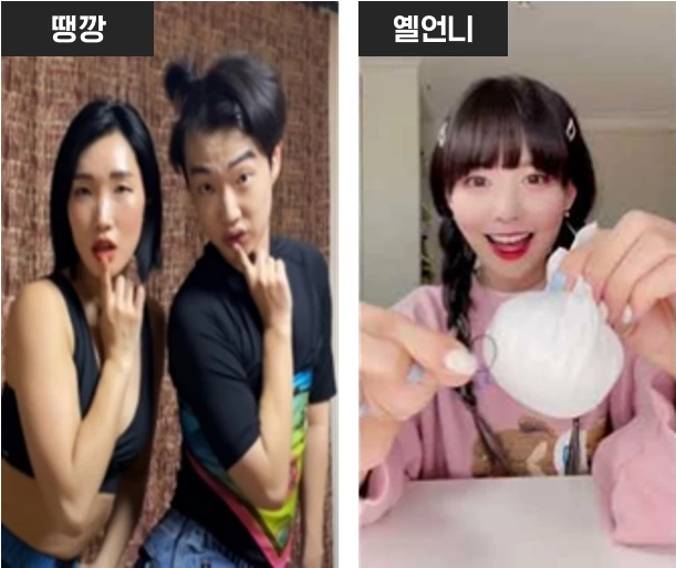 댄스 챌린지 또는 ‘오징어게임 패러디’과 같이 유행하는 소재를 활용해 짤처럼 제작한 콘텐츠 유형입니다. 쇼츠 론칭 초창기부터 많이 볼 수 있던 형식으로 ‘땡깡’, ‘옐언니’ 등 댄스 커버나 챌린지로 유명한 틱톡커들을 중심으로 소비되기 시작했습니다. 이는 음악, 댄스 커버 분야에서 두드러지게 나타나며, 현재 화제가 되는 아이템(인물, 사회/문화 이슈 등)을 기반으로 활발하게 생산되는 것이 특징입니다. ‘땡깡’의 경우, 가수들의 무대의상을 재현하며 디테일까지 표현한 퍼포먼스와 휴대폰으로 촬영한 고퀄의 카메라 무빙 등으로 화제를 모았습니다.