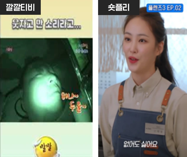 본편 영상을 쇼츠로 편집하여 활용하는 유형입니다. 디지털 제작물뿐만 아니라 TV, OTT 콘텐츠도 시청자들의 소구 포인트를 짧게 담아 본편의 하이라이트로 활용하거나 티저, 비하인드 등을 공유하고 있습니다. KBS의 옛날 예능 프로그램을 모아 업로드하는 채널 ‘KBS Entertain:깔깔티비’는 10년 전 예능의 하이라이트를 편집해 쇼츠로 업로드하고 있으며, 웹드라마 스튜디오 ‘플레이리스트’ 역시 ‘숏플리’라는 쇼츠 전용채널을 개설해 기존 웹드라마를 재가공하고 있고요. 자사 채널 ‘디글’, ‘샾잉’, ‘tvN D ENT’ 또한 '21년 7월부터 쇼츠를 활발히 활용하고 있죠.