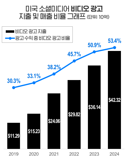 광고주들의 '동영상 광고' 지출이 빠르게 늘어나면서, 소셜미디어들의 광고 매출 중 '동영상 광고'가 차지하는 비율 역시 지속 증가하고 있습니다.