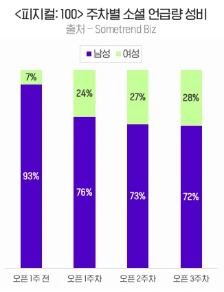 <피지컬: 100>이 여성 시청자도 유입시키면서 대중픽이 될 수 있었던 이유가 여기 있죠. 프로그램 시작부터 끝까지 성별은 사라지고 피지컬 좋은 100명만 남도록 모든 것을 동등하게 그려낸 덕분입니다.
