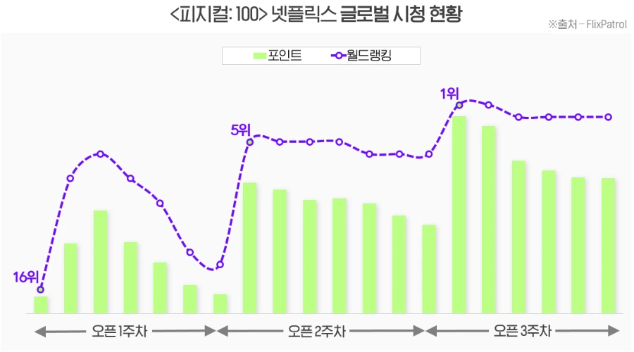 앞서 언급했듯, <피지컬:100>은 대중들이 손꼽아 기다리는 기대작도, 시작과 동시에 '떡상'한 것도 아니었습니다. 아래 넷플릭스 글로벌 시청 추이를 살펴보면, 2주 차에 특이점이 온 것을 알 수 있는데요.