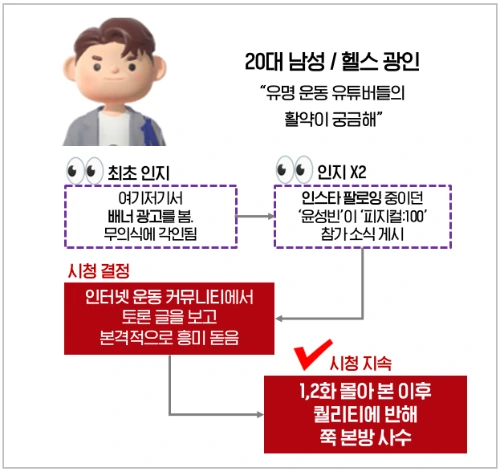 특히 <피지컬: 100> 같은 프로그램은 특정 타깃 (운동인/헬스인)이 아니면 인지 단계에서 멈출 가능성이 높은데, 이를 다음 단계로 보내주는 것이 바로 또 다른 소비자들의 긍정 언급과 추천인거죠.