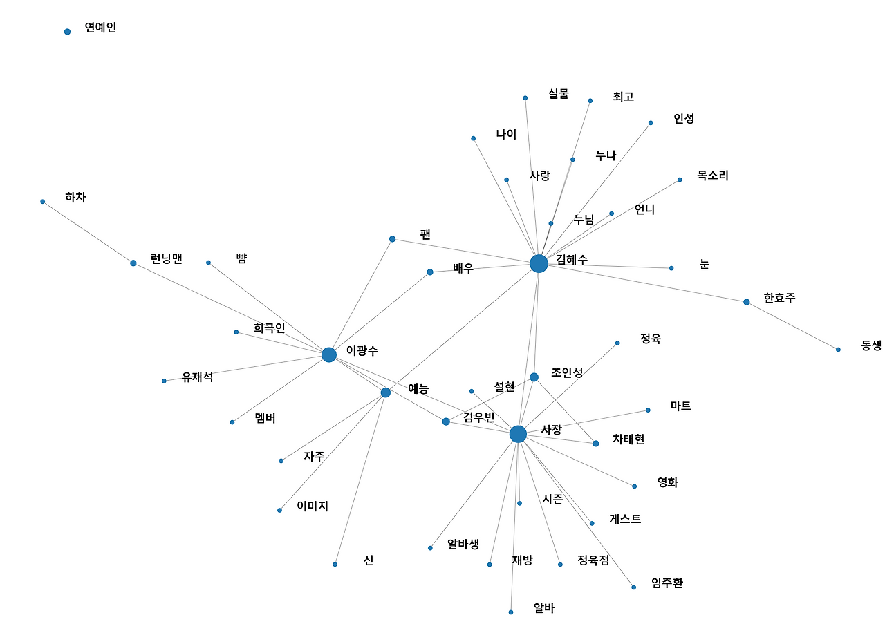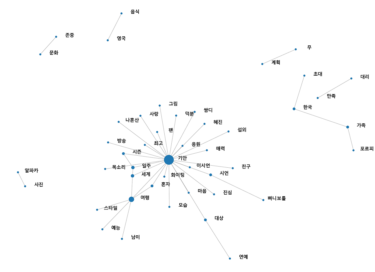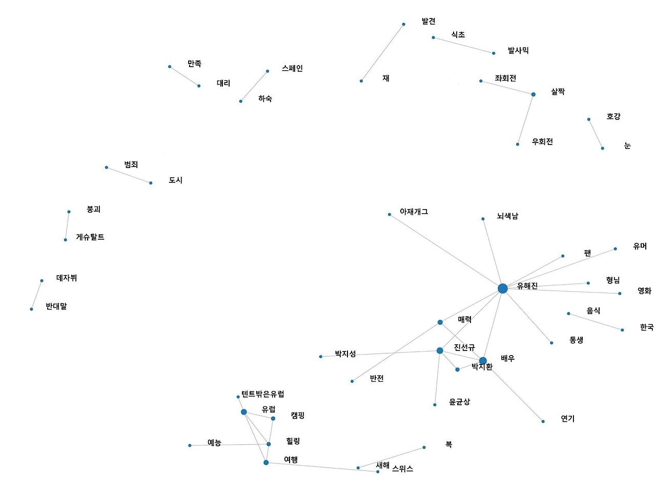 이 흔적들을 모두 모아서 키워드 네트워크 지도를 그려봤습니다.