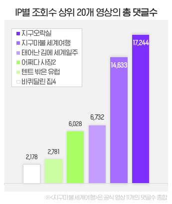 <지구마불 세계여행>과 <태어난 김에 세계일주>가 눈에 띕니다. 유독 두 IP가 같은 조회수의 클립이더라도 훨씬 많은 댓글이 달리고 있는데요. (악플 아니고, 논란 아니고, 긍정적인 시청 후기들!) 즉, 화제성의 총 규모를 떠나, 프로그램을 본 시청자들의 몰입도와 참여도가 가장 높다고 볼 수 있습니다.