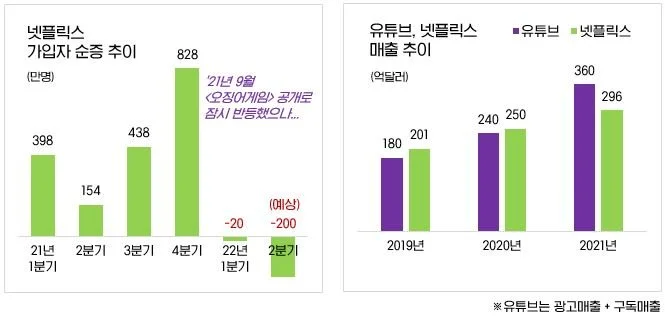 오리지널 콘텐츠 출혈 경쟁의 결과가... 가입자 감소, 매출 둔화라니.. 코로나 특수와 <오징어 게임>의 샴페인 거품이 사라지자마자 넷플릭스가 처한 현실이 드러나고 말았네요.