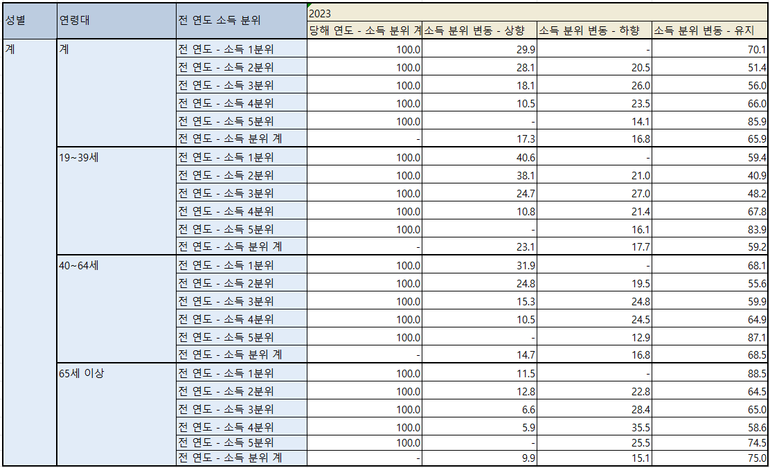 1. 국가데이터처,「소득이동통계」, 2023, 2025.11.18, 성별/연령대별/소득분위별 소득분위 이동비율[표1]