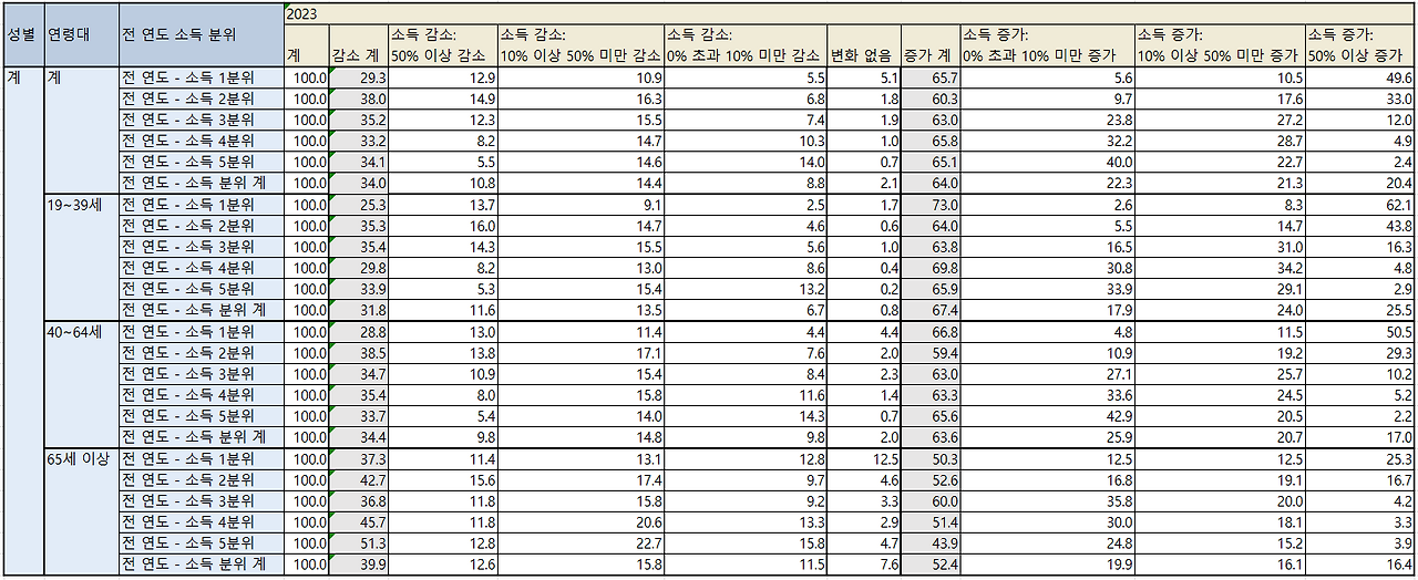 3. 국가데이터처,「소득이동통계」, 2023, 2025.11.18, 성별/연령대별/소득분위별 절대적 소득이동성[표3]