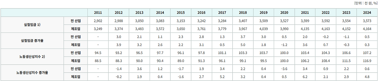 · 팩트 체크 (국가 데이터): 2011년부터 2024년까지 대한민국 실질 임금은 고작 23% 성장하는 데 그쳤다. 연평균으로 따지면 1% 남짓한 성장이다.