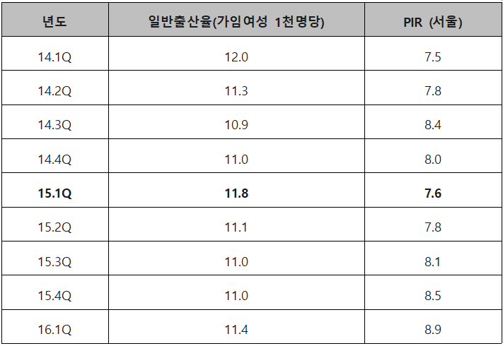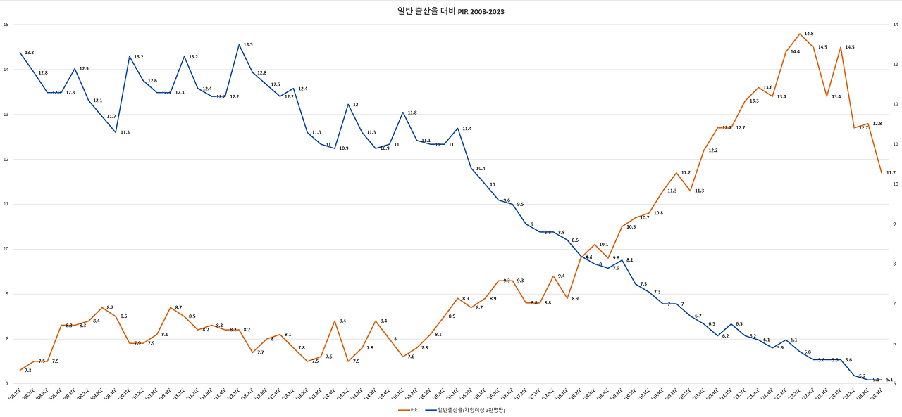 ㆍ2008-2014년 (안정기): PIR(빨간 선)이 7~8배 사이에서 등락을 반복할 때, 일반출산율(파란 선) 역시 11~13명 수준에서 안정적인 계절적 변동(1분기에 높고 4분기에 낮은)을 보이고 있다.