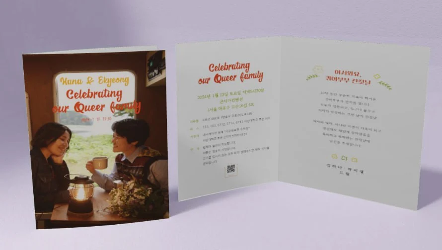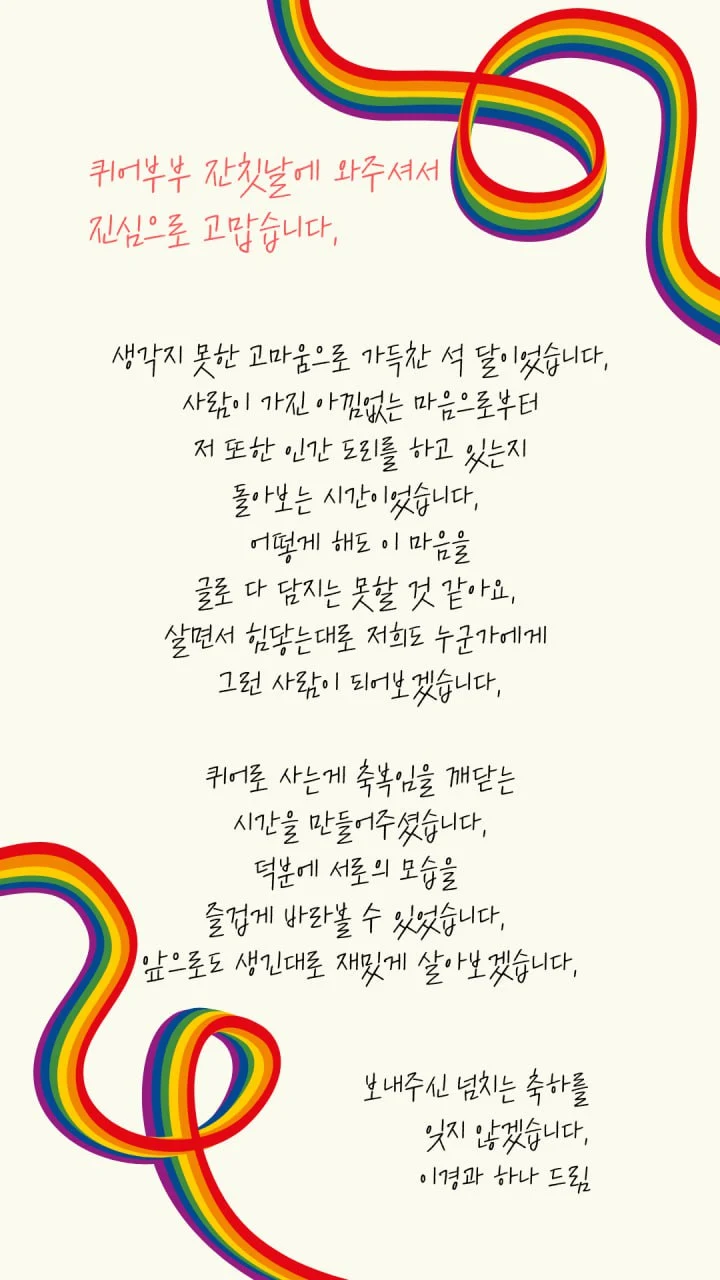 24년도 1월에 ‘어서 와요 퀴어부부 잔칫날’이라는 잔치를 열어 10년 동안 꾸준히 기족이 되어온, 앞으로도 서로의 가족으로 살아갈 것을 축하하고 축하받았다.(우린 잔치라 썼고, 모두는 결혼식이라고 불렀다.)