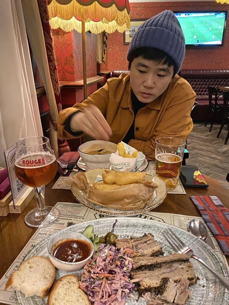 꺼지지 않는 불꽃이 있는 공원을 지나 강가에 갔다가 기대하던 레스토랑에 갔다. 생맥주를 다양하게 파는 집이었다. 똠양꿍(러시아에 의외로 똠얌이 많음), 훈제삼겹, 피시앤칩스를 시켰다. 매우 맛있지만 양이 많았다. 러시아 카페에서는 디쉬1개가 거의 0.5인분인 경우가 많았는데 여기는 진짜 1인분이었다. 쉴새 없이 달렸고 긴장한 탓에 술 한잔하며 잠든 날은 별로 없다. 오랜만에 긴장을 풀고 도시의 밤을 즐겼다.