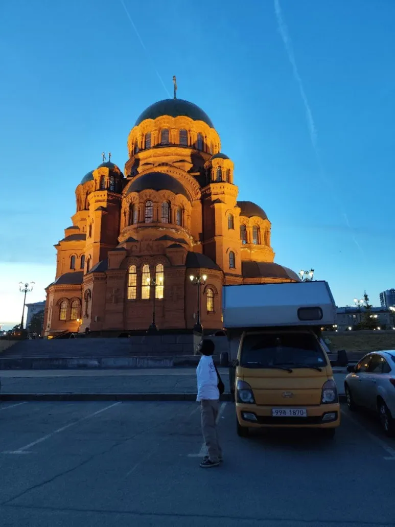볼고그라드 도시 중심인 알렉산더 네브스키 대성당 앞에 차를 세웠다. 해가 저물고 있어서 성당은 붉고 아름다웠고 날이 따뜻했다. 처음으로 나들이 복장(그나마 격식을 갖춘 옷을 한벌씩 가져왔다)을 갈아입고 가볍게 밤산책에 나섰다. 시베리아 횡단 동안 매일 상상했던 그 순간이었다. 선선한 밤공기를 마시며 거리를 걸으니 마치 서울에서 한강 근처를 산책하는 것 같은 느낌도 들었다. 볼가강을 끼고 있는 도시라 그럴지도 모른다.