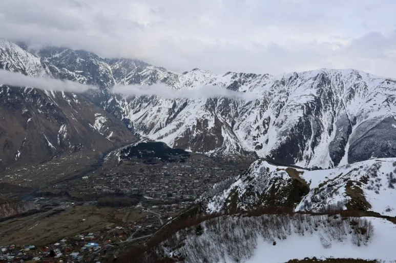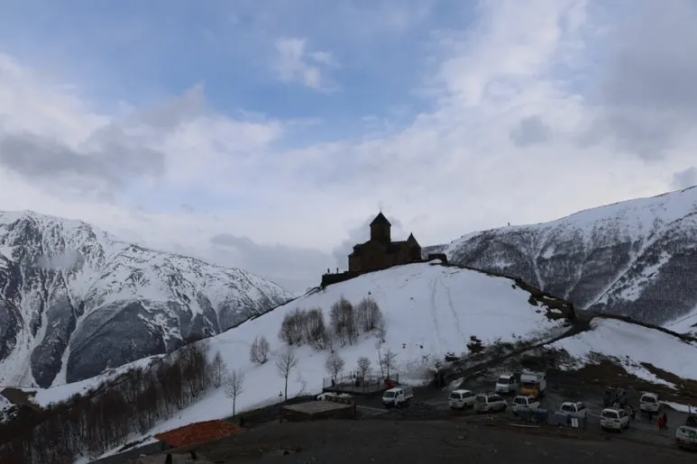 조지아 국경을 넘자마자 웅장한 카즈베기산의 풍경이 펼쳐진다. 한국사람에게는 CG같기도 하고 완전히 새로운 지형과 높이, 깊이, 넓이였다. 조지아를 보기도 전에 정이 다 떨어진 줄 알았던 우리는 놀라운 풍경에 감탄하며 길을 달렸다. 약 20키로도 달리지 않아 우리는 게르게티 츠민다 사메바 교회를 향했다. 카즈베기 산을 가장 잘 조망할 수 있는 높은 산위의 교회로 잘 알려진 관광지이기도 하다.