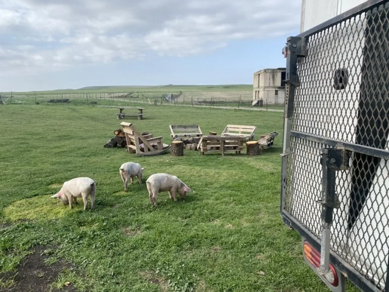 캠핑카 문열면 돼지가 풀뜯고 있다
