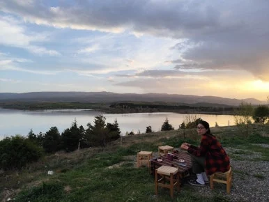 저녁 무렵, ‘괼로바’라는 마을에 도착했다. 캠핑카여행을 하면 ‘오늘 밤은 어디서 잘 것인가’가 최대의 과제가 된다. 우리가 지나는 길에서 구글맵과 ‘파크포나잇‘(세계 각지 차박 장소 공유 앱)에도 딱히 적당한 차박지 찾기 어려웠다. 호숫가 근처라면 어떨까해서 찾아온 괼로바 호수 근처 큰 공터가 나타났다. 차이와 식사를 파는 노점이 있었지만 우리가 차를 세우는 것에 크게 신경쓰지 않았다. 호수에 지는 노을을 보며 차이를 한잔 사 마시고 자리를 잡았다.