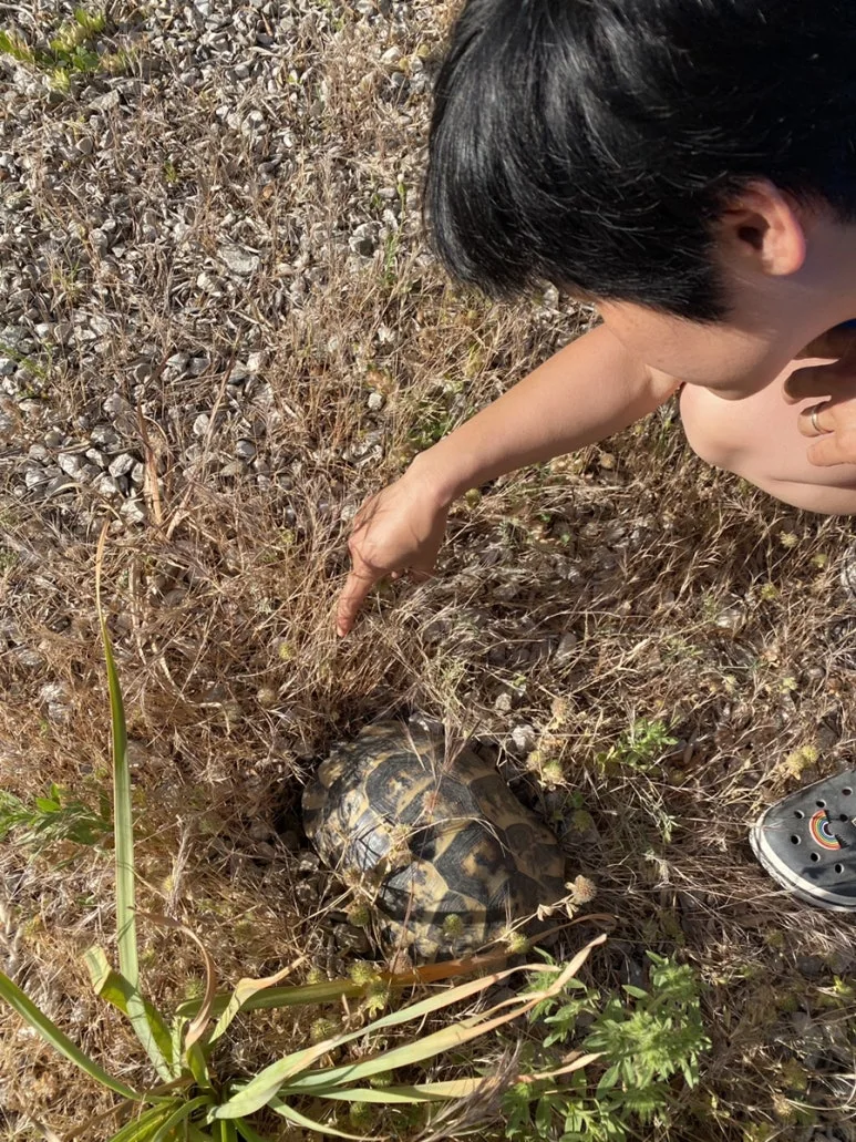 우리는 쓸 만한 곳에 자리를 잡고 의자도 펼쳤다. 완벽한 캠핑이었다. 곧이어 프랑스 가족이 캠핑카를 타고 들어왔다. 그들도 저 멀리 자리를 잡았다. 하나가 숲을 구경하다 거북이를 발견했다. 조지아에서도 보고 여기서도 봤는데 거북이는 이 동네에 상당히 많은 것 같다. 프랑스 어린이들과 하나는 거북이에게 한참 집중 하다가 헤어졌다.