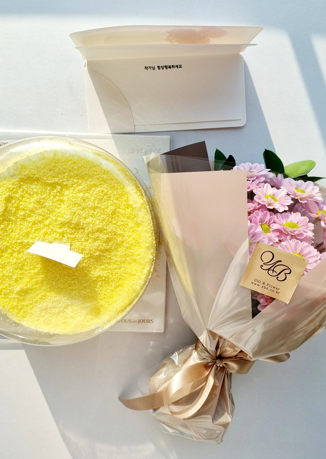 나 역시 책 선물 이벤트를 소소하게나마 두 번 진행했었다. 한 번은 새 책과 함께 초콜릿, 핫팩을 담아 보내드린 적이 있는데, 선물 받은 인친님께서 내게 서프라이즈 선물을 보내주셨다. 어느 날 저녁, 갑자기 집으로 커다란 박스가 도착. 그 안을 열어보니 예쁜 보라색 데이지 꽃다발과 고구마 케이크가 들어 있는 게 아닌가. 뭐지? 나한테 온 게 맞나? 혹시 잘못 온 거 아닌가? 처음에는 너무 당황해서 그런 생각들이 들었다. 어찌나 놀랐는지, "이게 무슨 일이야"라는 말만 계속 반복했다. 그리고 카드 속에 적혀있던 말.