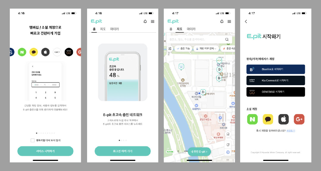 로그인 과정에서 장점인 현대/기아/제네시스 현대 계정을 상단 포지션으로 사용되게는 부분은 장점이다. 또한 소셜계정 간편 로그인 지원도 가능하게 하였다. 다만 전기차를 사용하는 외제차 차주분들께서는 소외감을 느끼실 수 있는 공급자 위주의 회원가입 레이아웃으로 다소 아쉬운 감이 있지만 이피트 서비스 회사가 현대/기아차라는 점을 이해하고 넘어간다.