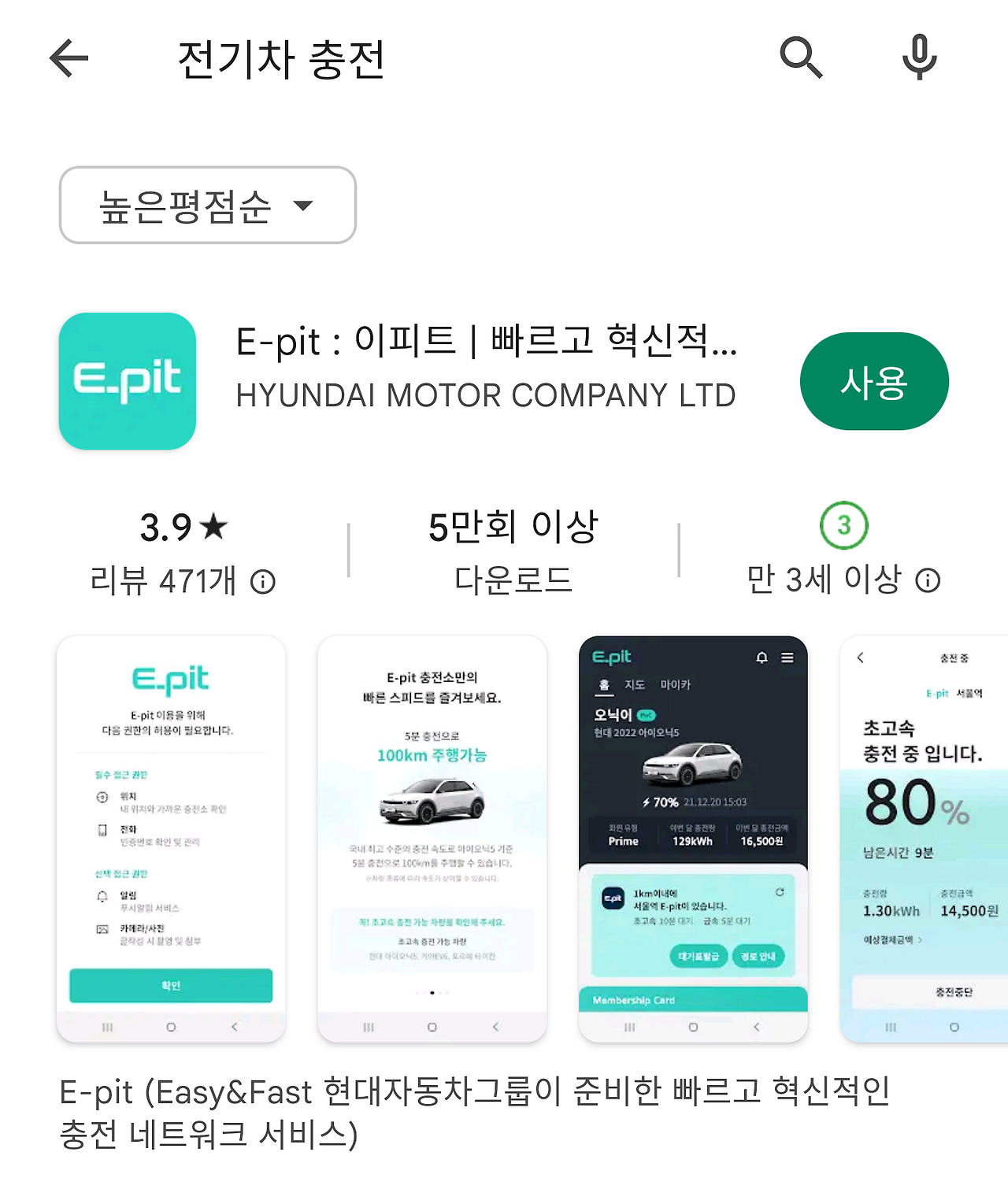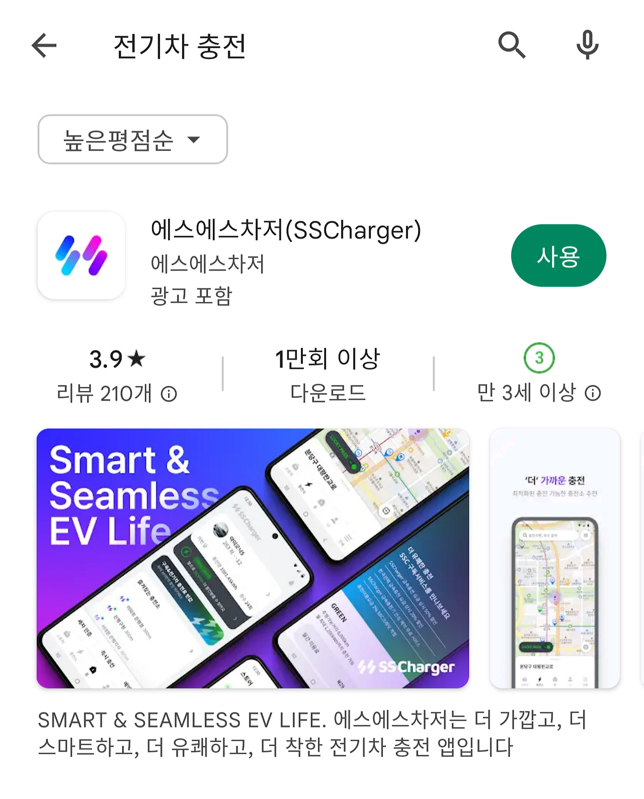 안드로이드 폰에서 '전기차 충전'으로 검색을 해보았다. 이피트 앱은 상위에 위치해 있고, 에스에스차저 앱이 보다 아래에 위치해 있는데, 구글 정책이 타이틀에서 최대한 일반 유저가 더 검색에 잘 걸리는 키워드를 삽입하는 등 여러가지 상위 노출 공식이 비공식적으로 있다. 에스에스차저 역시 타이틀에 핵심 키워드를 추가하여 상위 노출이 된다면 사용자가 증가할 것으로 보인다.