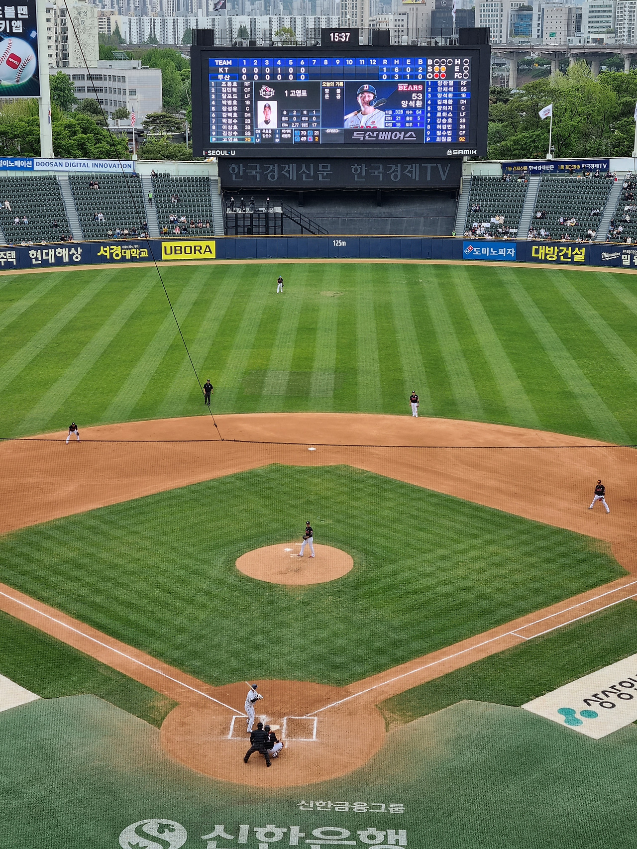 두산과 KT의 경기가 있던 날, 두산 팬인 큰딸과 함께 한 우리 가족은 잠실 야구경기장 내야석에 앉아 경기를 관람했다. "와~~~~" 절묘하게 상대 수비수 글로브를 빠져나가는 공의 움직임을 따라 함성과 함께 일제히 일어나는 사람들. 두둥두두둥 북소리. "두산의 안방마님 양의지(양의지). 안타를 날려줘요. 수빈아~~~" 정신없이 두 귀를 때리던 노랫말들. 응원이 빵빵했다. 거기 끼여서 좀 더 찐하게 외치고 싶을 만큼 멀리 있어도 응원 열기에 몸과 마음이 들썩거렸다.