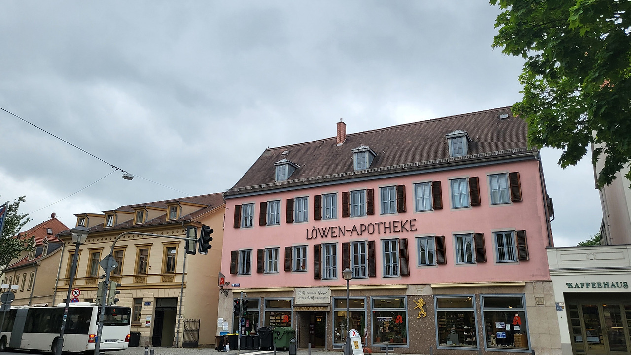 비텐베르크로 가기 위해 버스를 타러 가는 길에서 만난 약국 건물은 한자, 영어 외 다른 언어로 약국이라는 표시를 했다. 한국어로도 '약국'이라고 간판에 적시되어 있었다. 바이마르에서 만난 한국어는 무척 반가운 친구같았다.