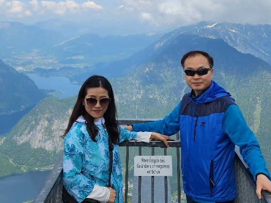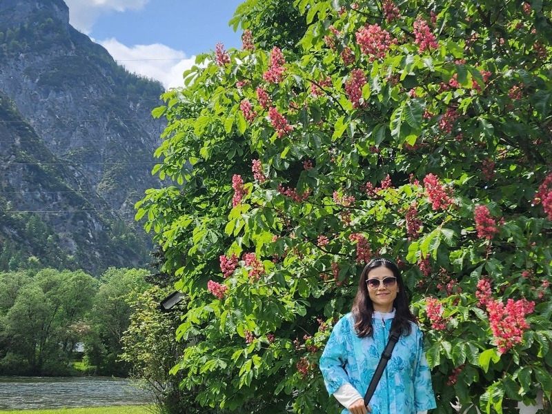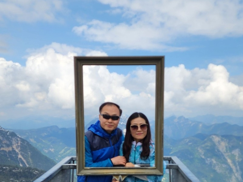 파이브핑거스 전망대에서 최고의 경치를 맛보고 하산하기 위해 가는 발걸음이 가벼웠다. 올라왔을 때는 미처 발견하지 못했던 레스토랑도 보고 케이블카를 기다리는 동안 아쉬움을 인증샷으로 남겨보았다. 케이블카를 타고 내려오니 주차장 한 켠에 예쁜 꽃이 하산한 우리를 환영해 주었다. 버스주차장에서 탑승하여 할슈타트 호수가의 식당에서 점심식사를 하기로 했다.