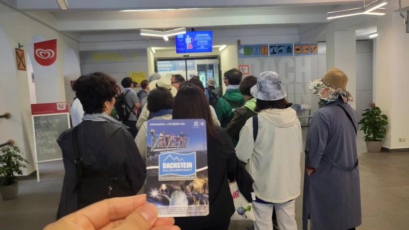다흐슈타인 매표소에 도착해서 표를 구입한 후 케이블카를 타고 1,350M의 중간 정류장에 내린 뒤, 케이블카를 갈아타고 올라가면 2,700M 고지에 오른다. 케이블카로 30분이면 파이브핑거스 정류장에 오르지만 하이킹을 하면 4시간정도 소요된다고 한다. 케이블카 아래로 걸어가는 사람들이 종종 보였다.