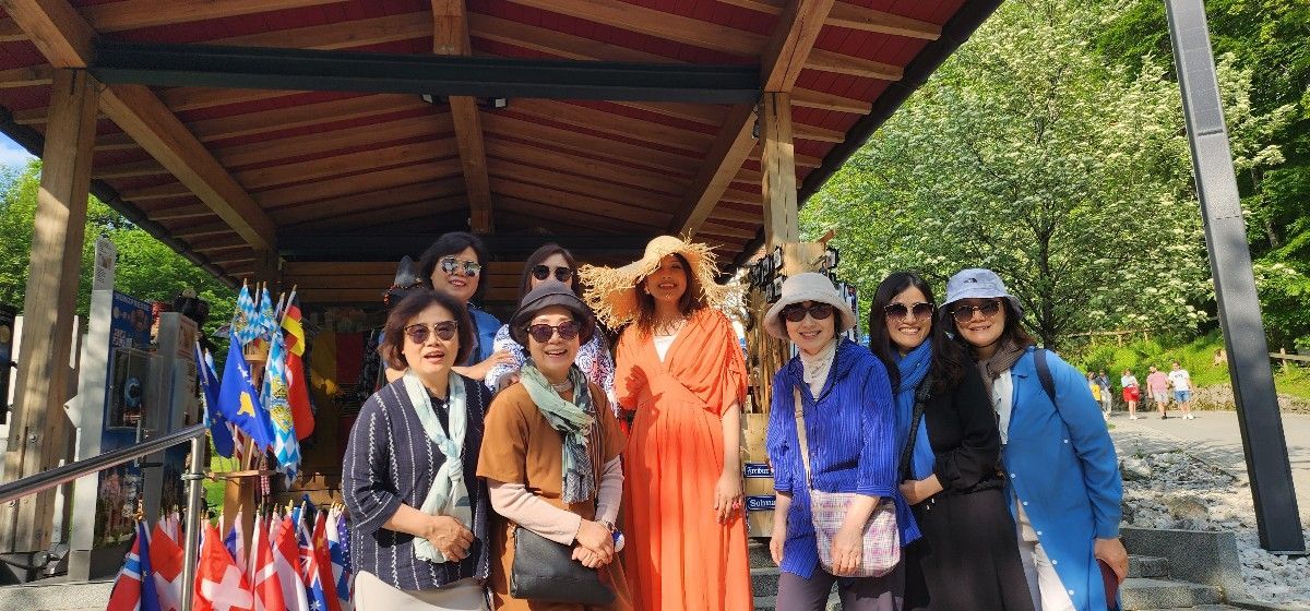 주차장으로 내려가는 길의 풍경도 아름다웠다. 내려가는 도중에 휴게소에서 동화 속 주인공같이 차려 입은 여인을 만나서 함께 사진을 촬영했다. 함께 사진을 찍자고 했더니 흔쾌히 허락을 해 주었다. 우리 모두가 동화 속 주인공이 되었다.