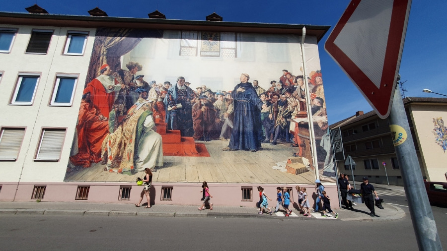 보름스 대성당 측면부에서 사진을 찍고, 정문으로 가는 길에 큰 건물에 보름스 제국회의 루터재판 벽화가 있었다. 황제 카를 5세가 루터를 소환해서 그의 의견을 묻는 장면이다. 벽면 전체가 벽화로 되어 있었다. 곳곳에서 루터의 흔적을 볼 수 있다. 맞은 편 건물 벽에 불상이 그려져 있었다.