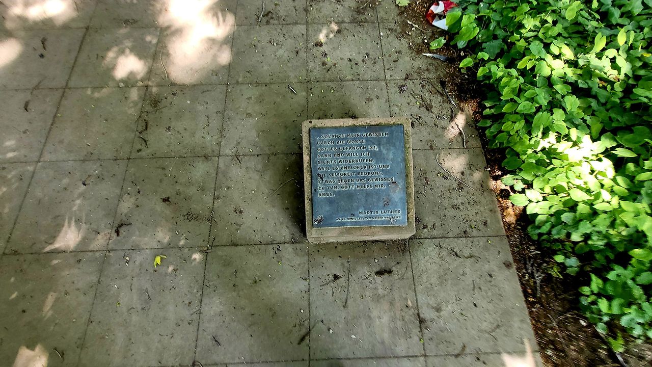 바닥 작은 동판에 "Hier stehe ich, Ich kann nicht anders, Gott helfr mir, Amen"이라는 글귀가 새겨져 있다. "제가 여기 섰나이다. 저는 달리 어찌할 수 없나이다. 하나님, 저를 도우소서." 마르틴 루터, 1521년. 4월 18일. 이라고 새겨져 있다.