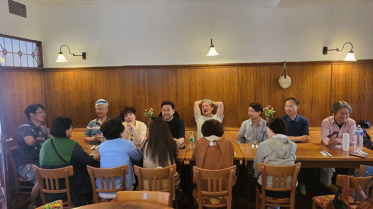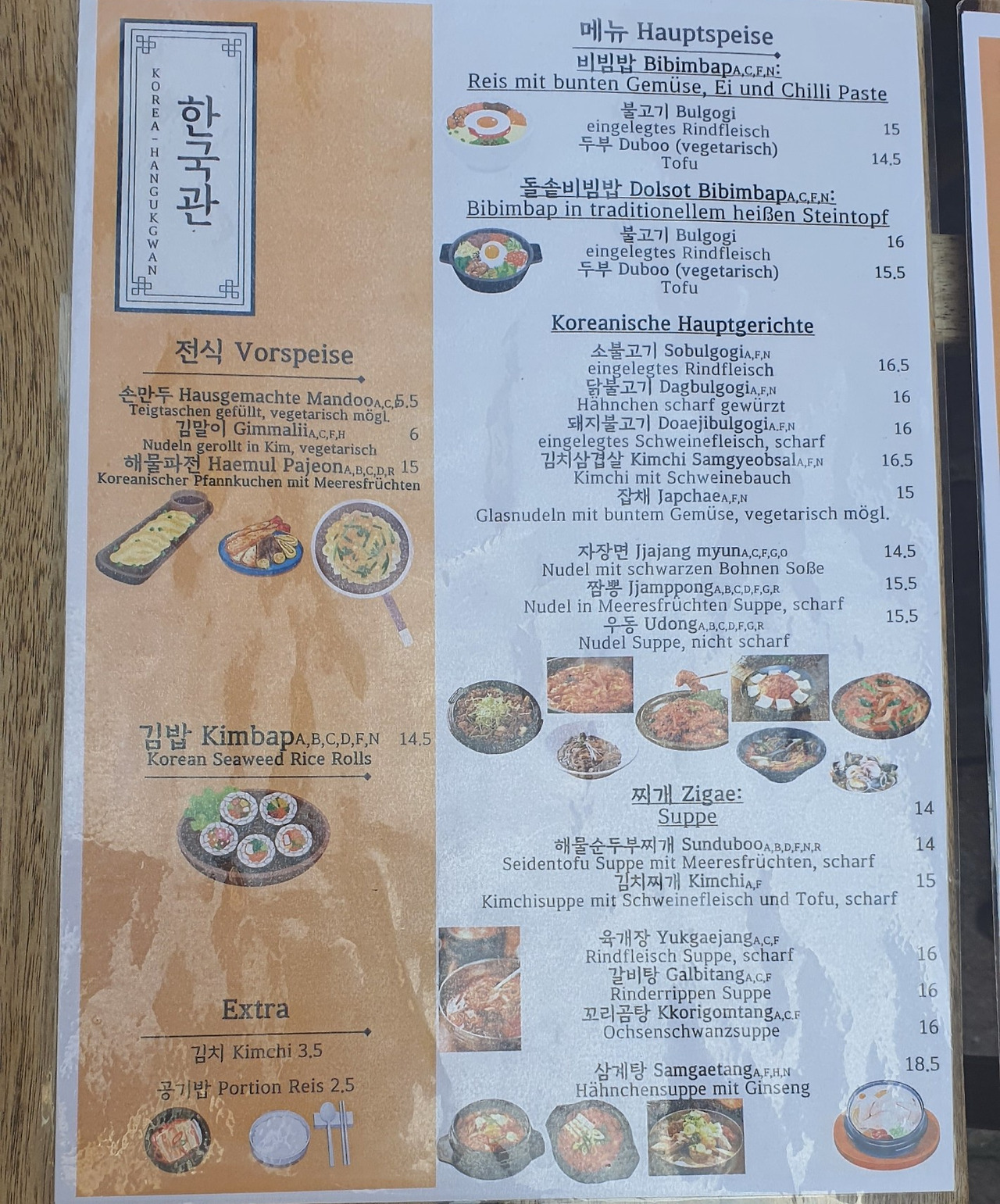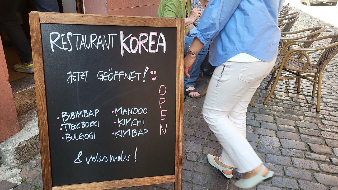입구에 조각보가 걸려 있고, 한글로 '떡볶이'라고 적혀 있는데 얼마나 반가웠는지 모른다. 메뉴가 다양했다. 김치찌개를 주문한 사람들이 많았는데 나는 비빔밥을 주문했다. 군만두를 서비스로 주셨다. '군만두 서비스'를 하이델베르크에서 받게 될 줄은 꿈에도 몰랐다. 전, 깻잎, 명이 나물이 반찬으로 나왔다. 재료를 한국에서 공수하시는 것인지 한국 음식맛 그대로였다. 음식 솜씨가 훌륭했다.