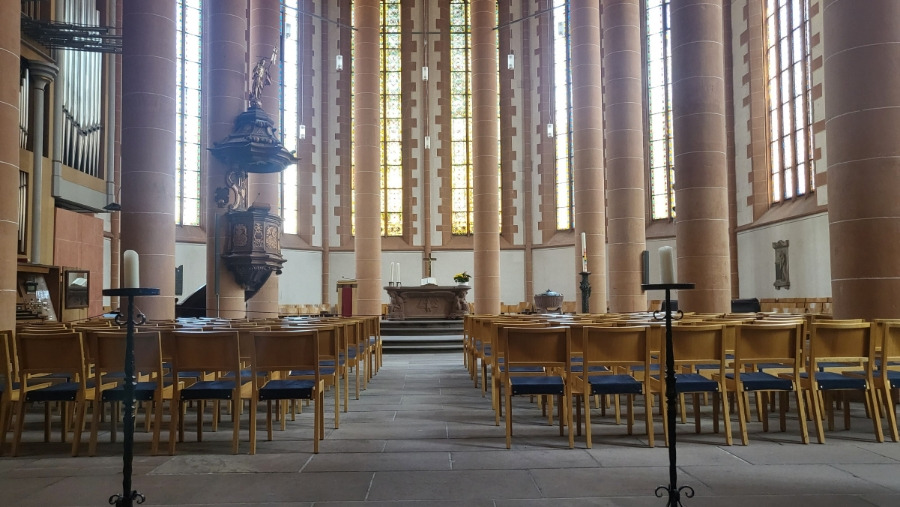 개혁교회이다 보니 왼쪽 기둥 위에 설교단이 있다. 가운데와 왼쪽에 성찬상과 세례반이 있다. 들리는 말씀과 보이는 말씀을 함께 예배당의 가장 중요한 곳에 두었다.