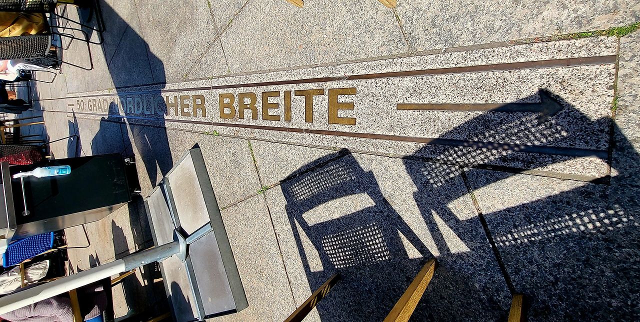 구텐베르크 동상 왼편으로 동으로 된 북위 50도 라인이 그려져 있다. 한반도 최북단이 중강진이고 북위 41도인데도 아주 추운 지역인데, 온화한 날씨의 마인츠가 북위 50도라는 것이 신기하다. 북위 38도선은 유럽에서 시칠리아, 아테네를 지나고 있다. 북위 50도 라인을 찾아가서 사진으로 담아 왔다.
