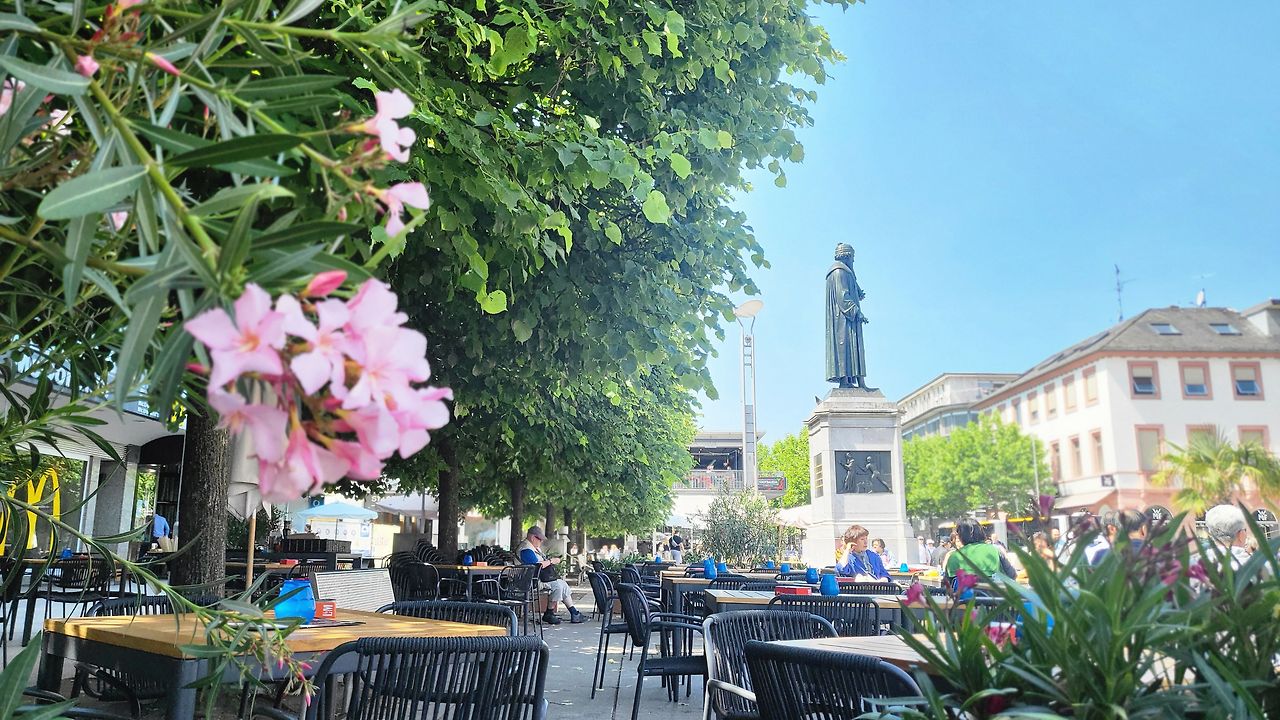 마인츠 주립극장 맞은편에는 쿠텐베르크의 동상이 있다. 동상 주변은 노천카페와 식당으로 형성되어 있다.