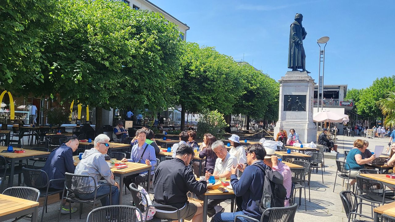 유럽여행 마지막 커피 타임-쿠텐베르크 동상이 보인다.
