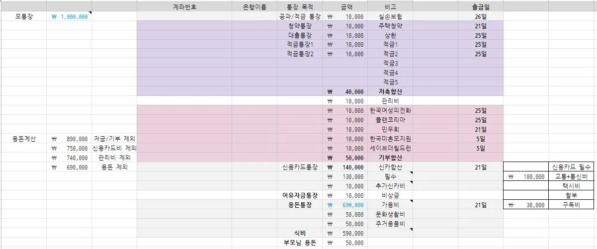 기본적인 틀은 아빠가 취직할 즈음 이야기 해준 통장 나누기 (는 취직 이래로 계속하고 있었다.)를 좀 더 세분화하고 + 이삭님의 포스타입에서 필요한 부분을 취했다.