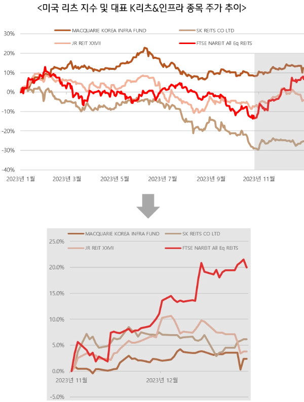 미국 리츠의 23년 1~10월 수익률이 -11.5%였던 반면, 11~12월 두 달 동안의 수익률은 +20%에 달했죠.